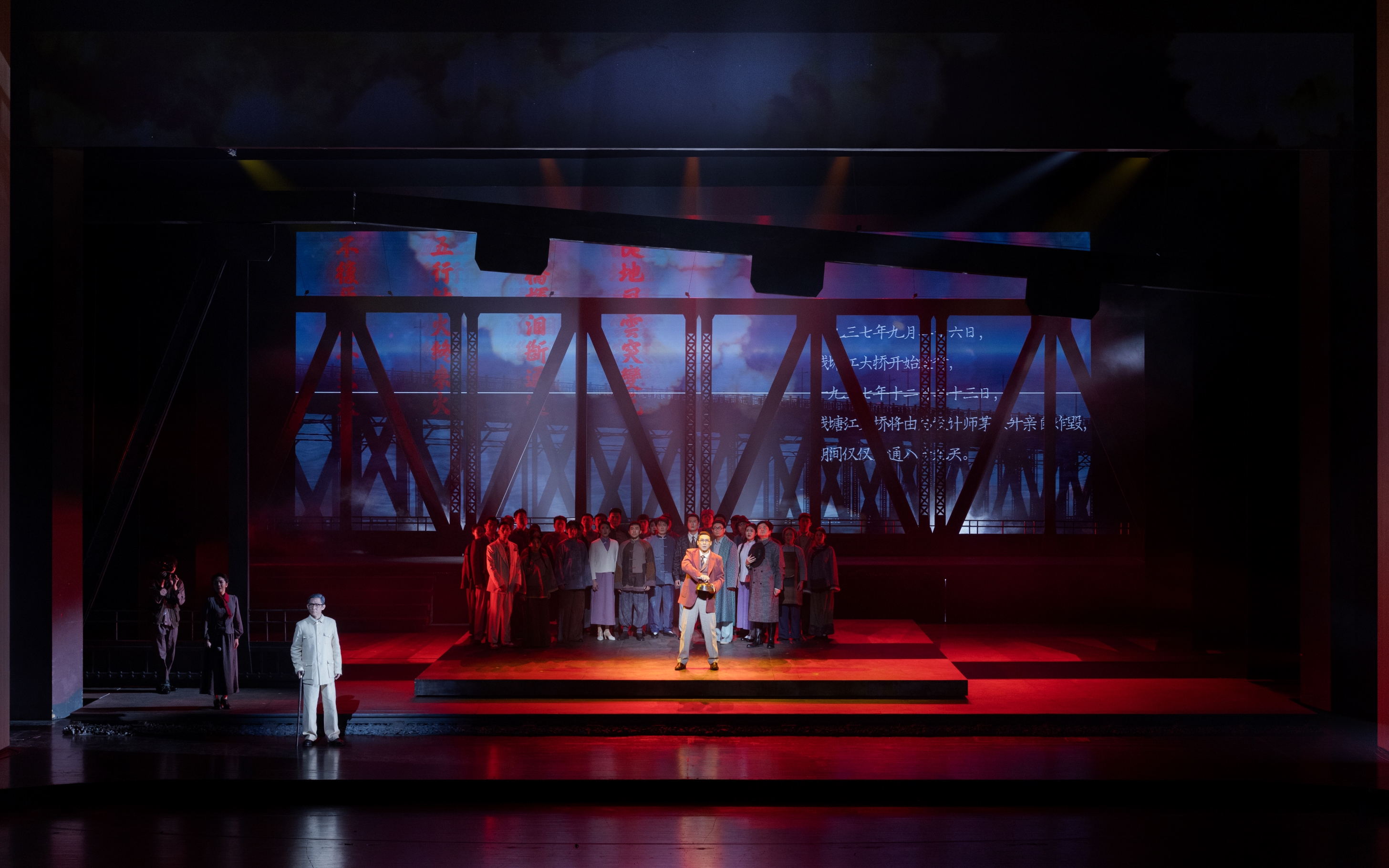 该剧讲述的是茅以升亲手将自己设计建造的钱塘江大桥炸毁以阻止日军侵华的历史事件。剧目聚焦老一辈知识分子在面对国仇家恨的重要历史时刻所彰显的不屈风骨,让一个个具体人物的悲欢离合、一批工程专家的家国情怀呈现在舞台,与“抗战胜利80周年”这一重大主题深度契合。