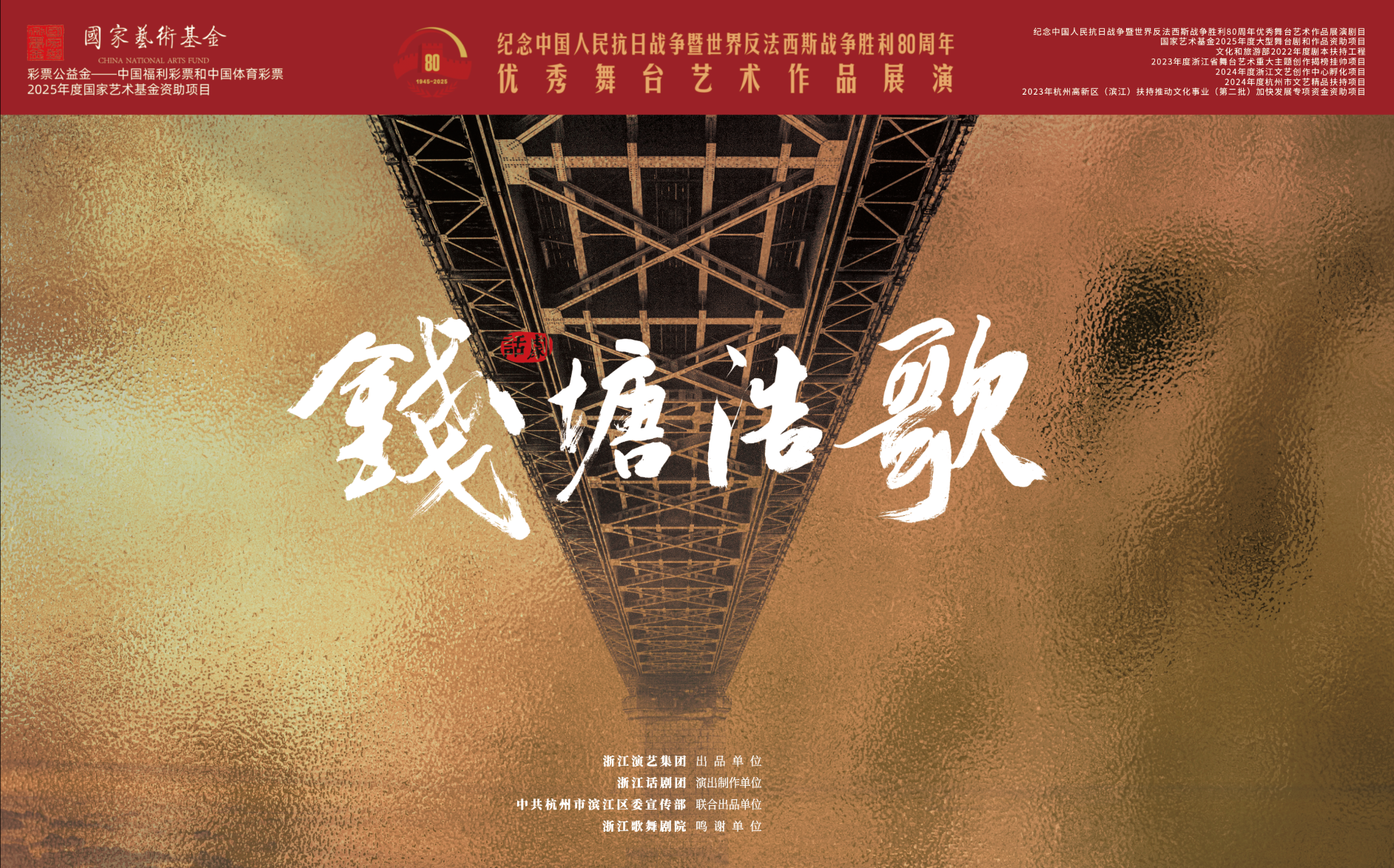 为隆重纪念中国人民抗日战争暨世界反法西斯战争胜利80周年,由中央宣传部、文化和旅游部主办,中央宣传部文艺局、文化和旅游部艺术司承办的纪念中国人民抗日战争暨世界反法西斯战争胜利80周年优秀舞台艺术作品展演活动于2025年8月下旬至10月下旬在北京举办。